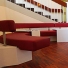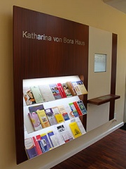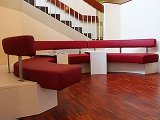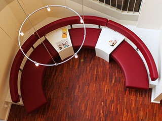 Es wurde ein einheitliches Nutzungskonzept entwickelt. So erhielt auch der Eingangsbereich mit einem offnen Tresenbereich, einer Sitzrunde und Medienwand ein neues Erscheinungsbild.