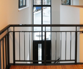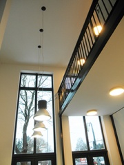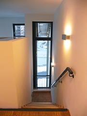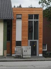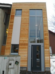 Das Bestandsgebäude erhielt eine 2-geschossige Erweiterung. Sie beinhaltet eine behindertengerechte Erschließung und einen Aufenthaltsbereich im Erdgeschoss. Die neue Fassade bildet durch ihre Holz-Rautenschalung einen starken Kontrast zu der Fassadengestaltung des Bestandes. Der Baukörper ist mit einer Glasfuge an das Bestandsgebäude angeschlossen.
