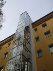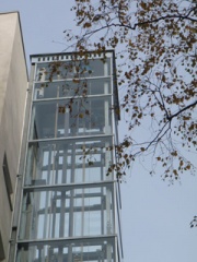 An das hofseitige Treppenhaus des Mehrfamilienhauses wurde ein Aufzug in einem 3-seitig verglasten Aufzugsschacht in Stahlkonstruktion errichtet. Es gibt insgesamt 4 Haltestellen. Der Aufzug ist unmittelbar an das Treppenhaus angebaut. Der Zugang zum Aufzug erfolgt von der Treppenhausseite. Die Wohnungen werden vom Zwischenpodest über jeweils einen Treppenlauf erschlossen. Im Dachgeschoss wurde ein zusätzliches Podest auf dem Geschossniveau hergestellt, so dass die Wohnung stufenlos erreichbar ist.