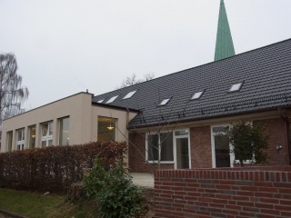 1958 wurde das Kirchenzentrum in direkter Nähe zur Tornescher Kirche errichtet. Das Gebäude wird für kirchliche Zwecke wie z.B. Jugendarbeit und Gemeindefeiern genutzt. Durch den Umbau und die Erweiterung wurde neben der Verbesserung des energetischen Konzepts auch die Grundrissgestaltung optimiert. Der Gemeindesaal wurde vergrößert und barrierefrei ausgebaut. Das Kirchenbüro ist nun im Gebäude integriert. Das Obergeschoss steht für die Jugendarbeit zur Verfügung. Hier sind WC-Anlagen, eine Teeküche und ein Diakon-Büro mit untergebracht. Das gesamte Gebäude wurde energetisch saniert. Das Dach wurde neu eingedeckt und gedämmt. Die Fenster wurden ausgetauscht und die alte Ölheizung in eine moderne Gasbrennwerttherme getauscht.