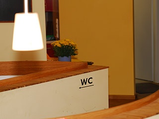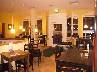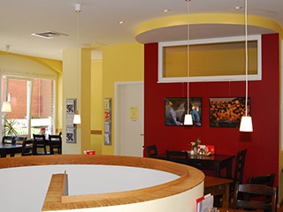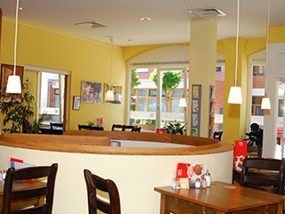 Diakonischen Werkes Hamburg-West/ Südholstein. Die Räumlichkeiten wurden für das Café, das über eine Vollküche verfügt, aus- und umgebaut. Hier können nach der Baumaßnahme bis zu 50 Gäste bewirtet werden. Für Kleingruppen kann ein separater Raum abgetrennt werden. Für eine helle und freundliche Atmosphäre wurden kräftige Farben gewählt.