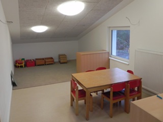Der Neubau gliedert sich in 2 Baukörper mit flach geneigten Pultdächern, die über ein zentrales Forum miteinander verbunden sind. Im Obergeschoss gibt es neben den Gruppenräumen einen Multifunktionsraum, der zu gemeinsamen Aktivitäten sowie als Bewegungsfläche genutzt wird. Das Außengelände wurde entsprechend dem Geländeverlauf modelliert. Neben dem zentralen Platz, der auch für Gemeindeaktivitäten vorgesehen ist, entstanden geschützte Spielbereiche für die Krippenkinder sowie attraktive Bewegungsflächen für die „Großen“.