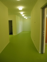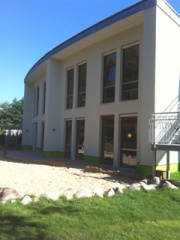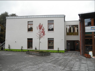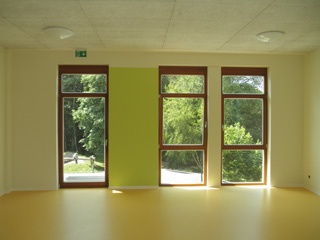 Der Neubau schließt sich als ein zweigeschossiger, offen gestalteter Baukörper mit flach geneigtem Dach an das Bestandsgebäude an. Die Außenwände stellen sich als massive Wandscheiben mit einzelnen Fensteröffnungen dar. Der Neubau öffnet sich zur Gartenseite durch großzügige Fensterfassaden. Ein Erschließungskern bildet die Verbindung zwischen Bestandsgebäude und Neubau.