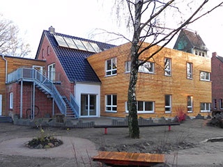 Bei dem Bauprojekt handelt es sich um den Umbau und die Erweiterung einer bestehenden Kindertagesstätte in Hamburg-Schnelsen. Der Bestand bestand aus mehreren Anbauten und beinhaltete die Nutzungen Wohnen und Kindertagesstätte. Im Zuge der geplanten Baumaßnahmen sind eine energetische Ertüchtigung, innere Umbauten zur Ordnung der Raumstruktur, sowie ein zweigeschossiger Anbau in Holzständerbauweise realisiert worden. Die zusätzlichen Flächen sind zur Vergrößerung der Gruppenräume vorgesehen. Das Gesamte Gebäude wird jetzt als Kindertagesstätte genutzt.
