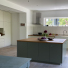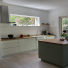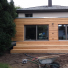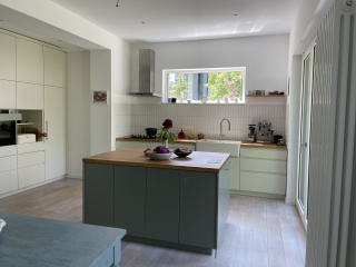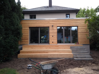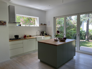 Der gartenseitige Anbau mit Holzverkleidung und davor liegender Terrasse vergrößert den Wohn- und Essbereich. Die großformatigen Fenster belichten den neu geschaffenen Wohnraum und bieten den freien Blick ins Grüne. Im Inneren des Baukörpers wurde die Küche mit individuellen Einbauten und Möbeln geplant und realisiert. Die Bauphase fand im bewohntem Zustand statt.