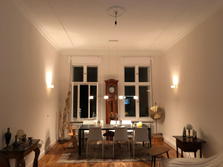 Die Sanierung dieser Wohneinheit in einem historischen Mehrfamilienhaus wurde begleitet von der Planung diverser Möbeleinbauten. Das Berliner Zimmer wird als Küche genutzt mit einem großzügigen Aufenthaltsbereich.