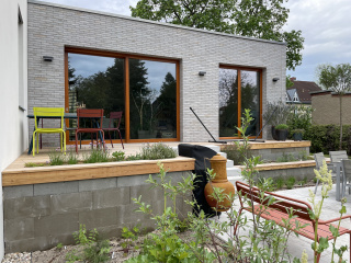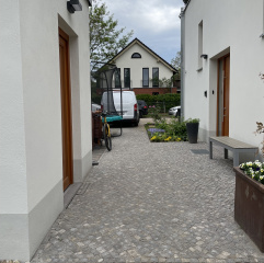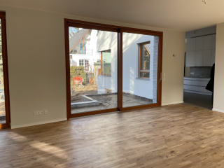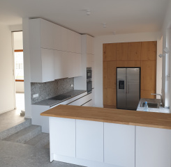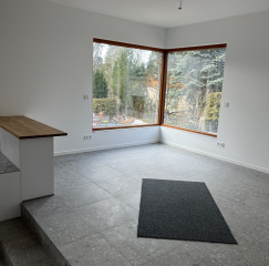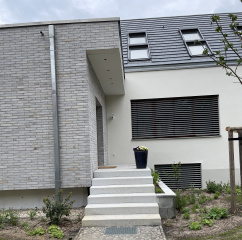 Auf dem zu bebauenden Grundstück befand sich ein kleines Einfamilienhaus mit Keller. Nach Abstimmung der Planung sollte eine großzügige Erweiterung unter Nutzung der vorhandenen Bausubstanz entstehen. Das Gebäude wurde auf den Fundamenten bzw. dem Kellerraum des Altbaus in Massivbauweise errichtet. Die Außenwände blieben zum Teil erhalten, die Öffnungen wurden jedoch an den neu strukturierten Grundriss angepasst. Der Erschließungsbereich wurde erneuert und verbindet nun alle Stockwerke. Die energetische Ausstattung des Gebäudes entspricht mit Photovoltaikanlage und Erdwärmepumpe dem neuesten technischen Standard.