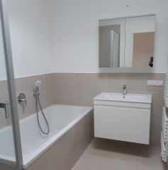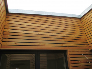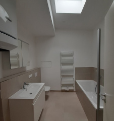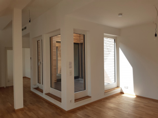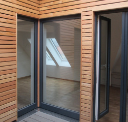 Bei dem 4-geschossigen Vorderhaus wurde das Dachgeschoss ausgebaut und zwei zusätzliche Wohneinheiten geschaffen. Da sich das Gebäude im denkmalgeschützen Bereich befindet war ein Ausbau mit Balkonen nicht möglich. Alternativ wurden Patios realisiert, die eine Innere Belichtung ermöglichen und als Terrasse fungieren.